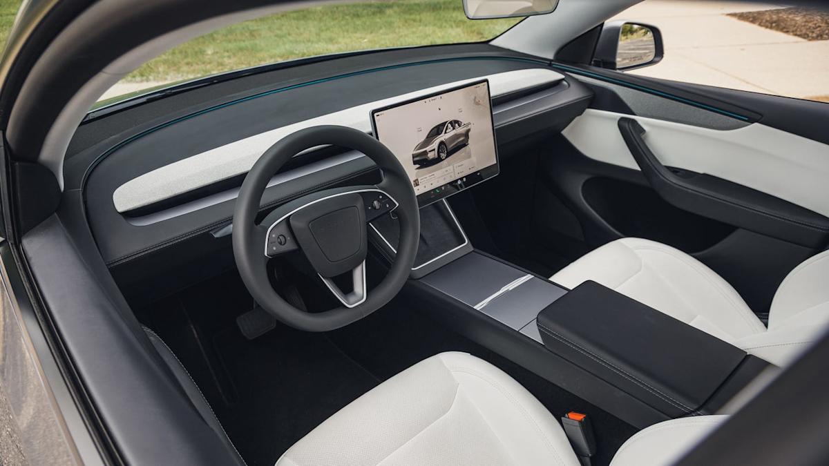 Внутри отличия заметны прежде всего тем, кто хорошо знаком с предыдущей Model Y. Исчезли деревянные вставки, им на смену пришла текстильная фактура. Центральная консоль между сиденьями стала более продуманной, а подстаканники теперь можно закрывать.