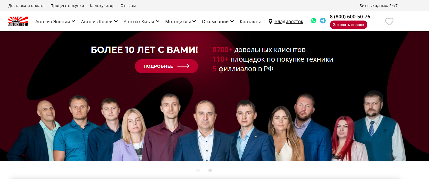 Autosender — надёжный поставщик автомобилей из Японии, Южной Кореи и Китая, работающий на рынке с 2011 года. За годы деятельности компания зарекомендовала себя как стабильный и ответственный партнёр, обеспечивая качественный подбор и безопасную доставку автомобилей под заказ.