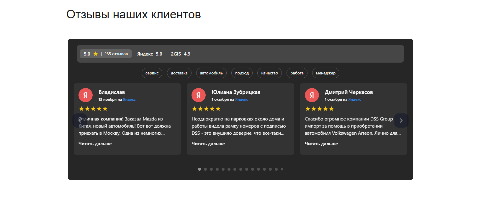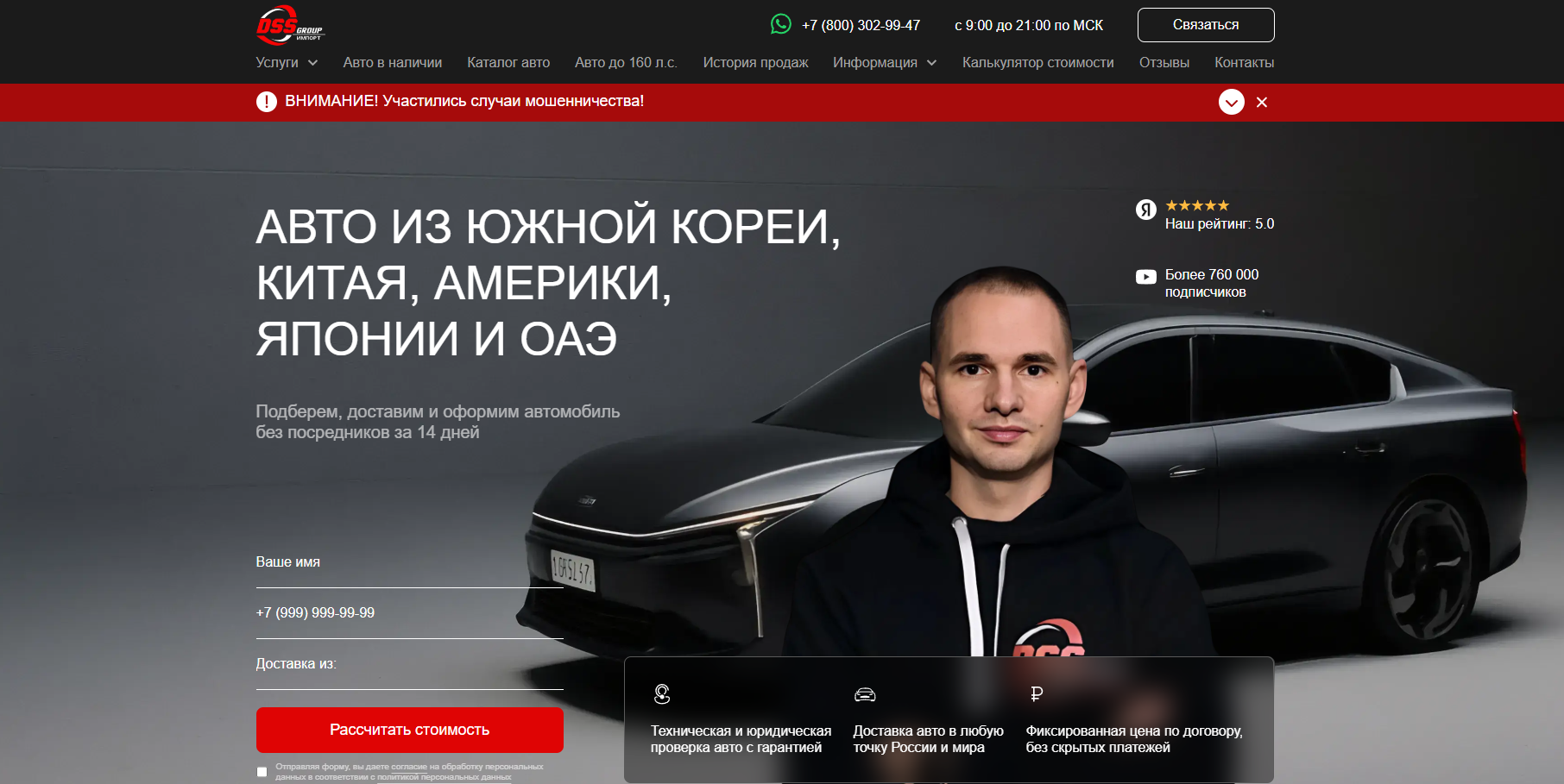 DSS Group – профессиональный импортер автомобилей из Южной Кореи, Китая, Японии, США и ОАЭ, работающий на рынке с 2018 года. Подобрали 87 000 транспортных средств, доставили более 5 000 автомобилей. Команда компании состоит из 150 специалистов. Никаких скрытых комиссий и мелкого шрифта.